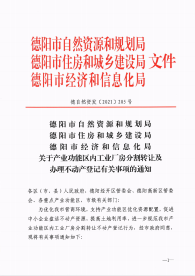 为深入贯彻落实党中央、国务院关于深化“放管服”改革和优化营商环境的决策部署,德阳市深化要素资源市场化配置改革,促进土地集约高效利用,推动经济高质量发展,切实解决企业和政府面临的问题,由自然资源部门、住建部门和经信部门联合出台了《关于产业功能区内工业厂房分割转让及办理不动产登记有关事项的通知》(德自然资发〔2021〕205号),允许产业功能区内土地使用性质为工业用地,且已办理不动产首次登记的工业厂房,在符合分割受让的准入条件、分割转让中涉及产业功能区产业布局、房屋质量安全、消防安全、生态环境准入、建设规划等要求的前提下,可办理分割转让。