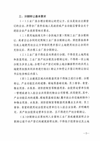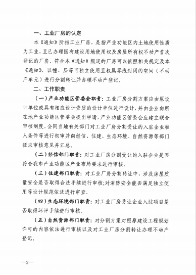 明确产业功能区内工业厂房可按幢、层等固定界限为基本单元分割,同时限制工业厂房在层内再进行分割,不得改变土地和房屋用途,不得分割土地,办理不动产登记时除土地分摊面积外其余土地按共同共有进行标注,以防范擅自改变土地和房屋用途进行商品房开发。
