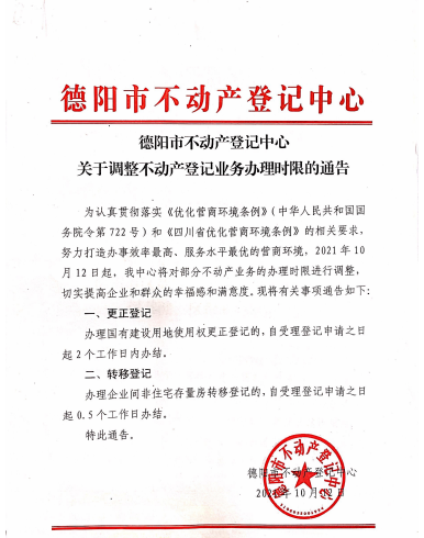 为了提供更优质的营商环境,本着从减少企业“时间成本”的角度考虑,市不动产登记中心加强与税务部门的沟通衔接,从2021年10月12日起,再次压缩不动产登记办理时限,将企业间非住宅存量房转移登记承诺时限压缩至0.5个工作日办结。